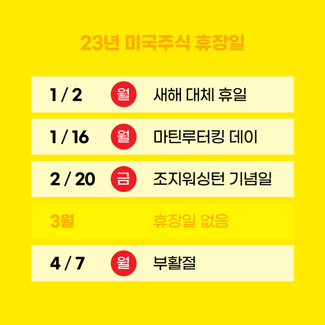 2022년에는 전체적으로 국내나 해외 주식시장이 좋지 않았지만 그래도 2023년에도 해외주식은 쭈~욱 계속됩니다! 혹시나 미국 주식시장 휴장일인데 잠 안자고 새벽까지 왜 주가가 움직이지 않지?라는 귀여운 실수를 하지 않기 위해 2023년 미국주식 휴장일을 정리해 보았어요!