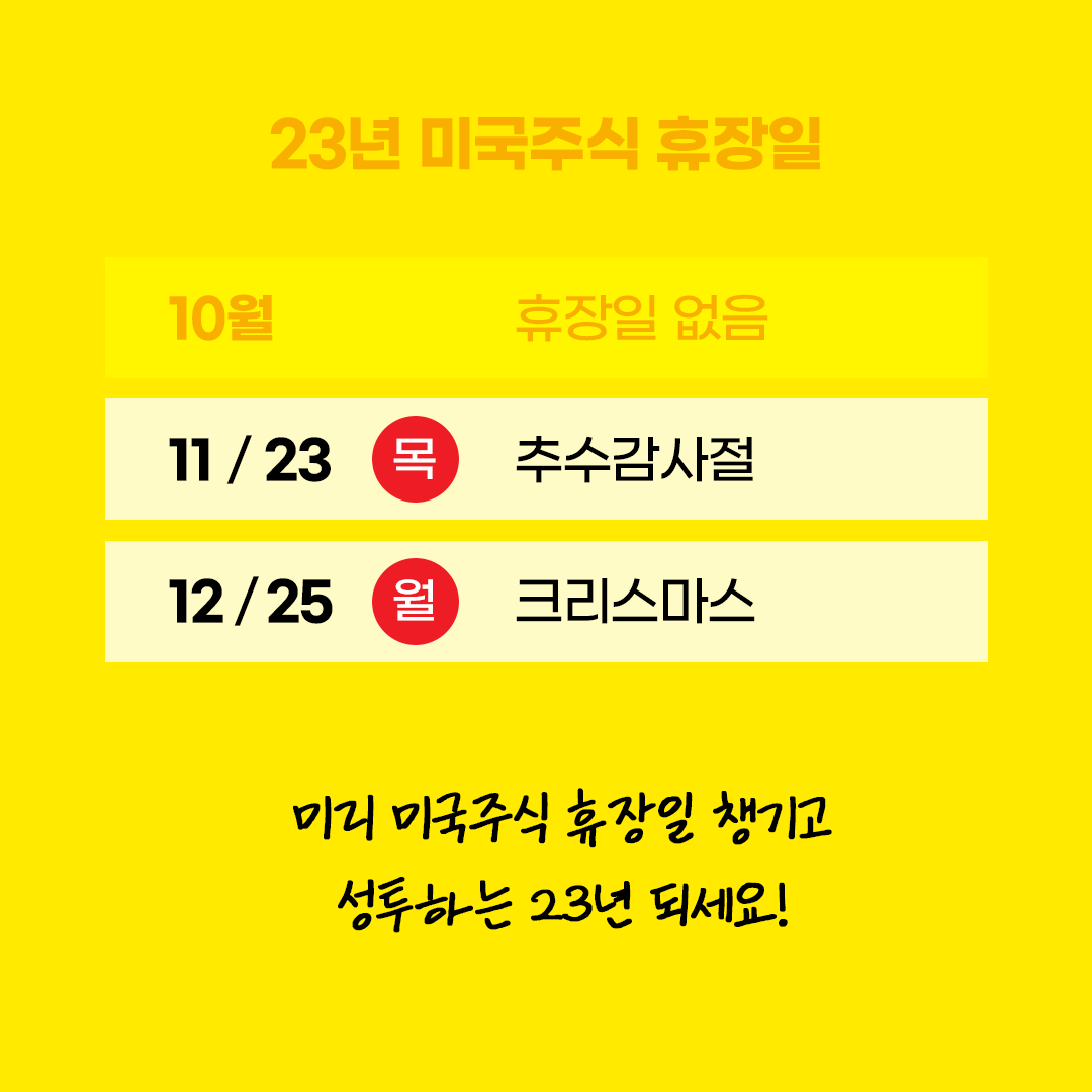 연말에는 추수감사절과 크리스마스만 기억해두시면 돼요! 23년에는 올해와 다르게 산타랠리가 찾아오는 한 해가 되었으면 하는 바람입니다!